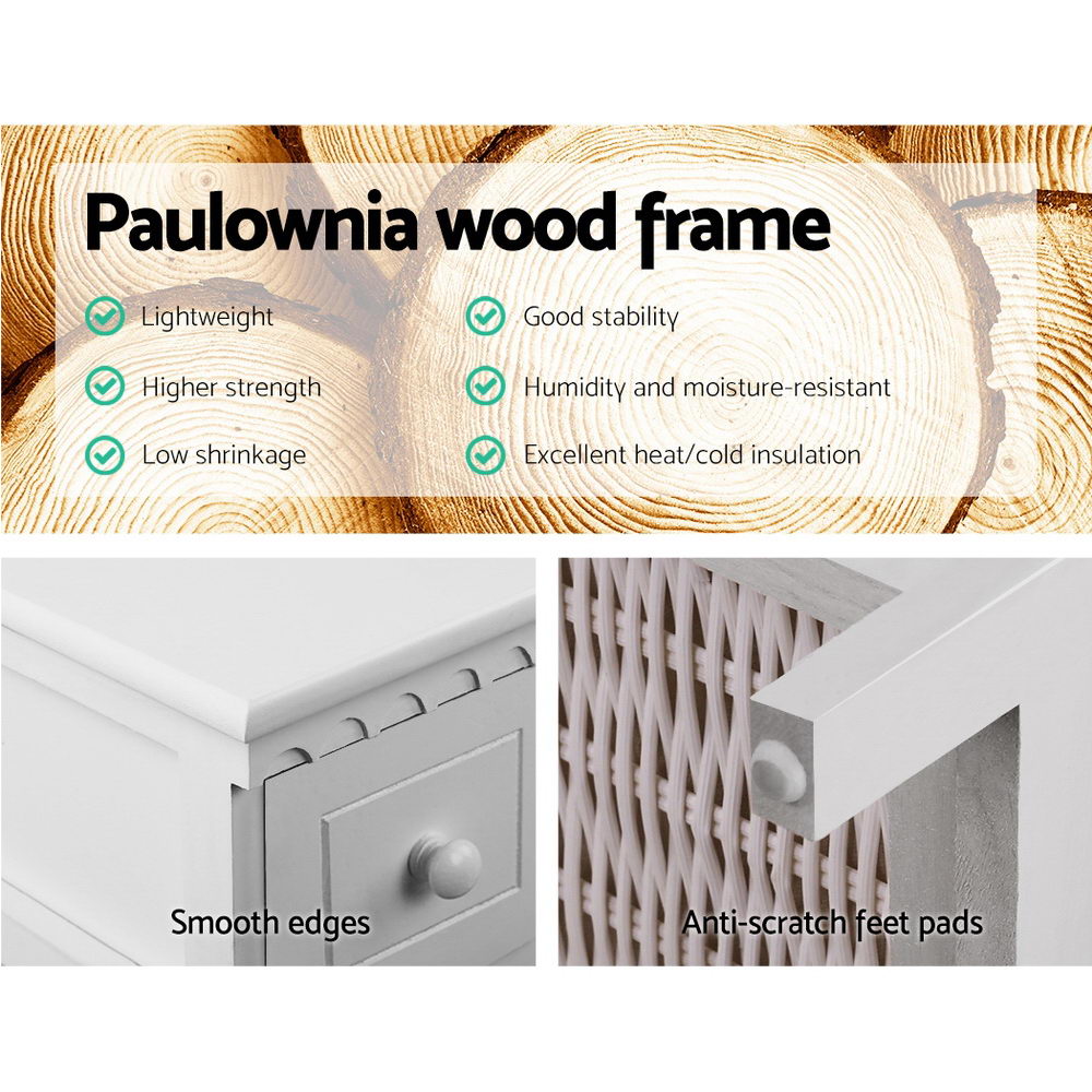 Looking for that cottagecore aesthetic without moving to the countryside? Add a chic, rustic presence to your home with the Artiss 3-basket Cabinet. Beautifully crafted in an endearing combination of Paulownia wood, MDF board, plywood and PP material, this cabinet evokes a charming, simple living feel and is useful in so many ways. The design has a timeless appeal, and its practicality is enhanced by the two deep drawers and three movable baskets with polyester cloth liners that are washable for easy maintenance. The cabinet will match perfectly with your existing décor thanks to its neutral white tones, so you can use it in any room. Not least, the anti-scratch feet pads will help to keep your floor in pristine condition. The cabinet comes fully assembled so you can place it straight out of the box. Get yours today and create your perfect home.