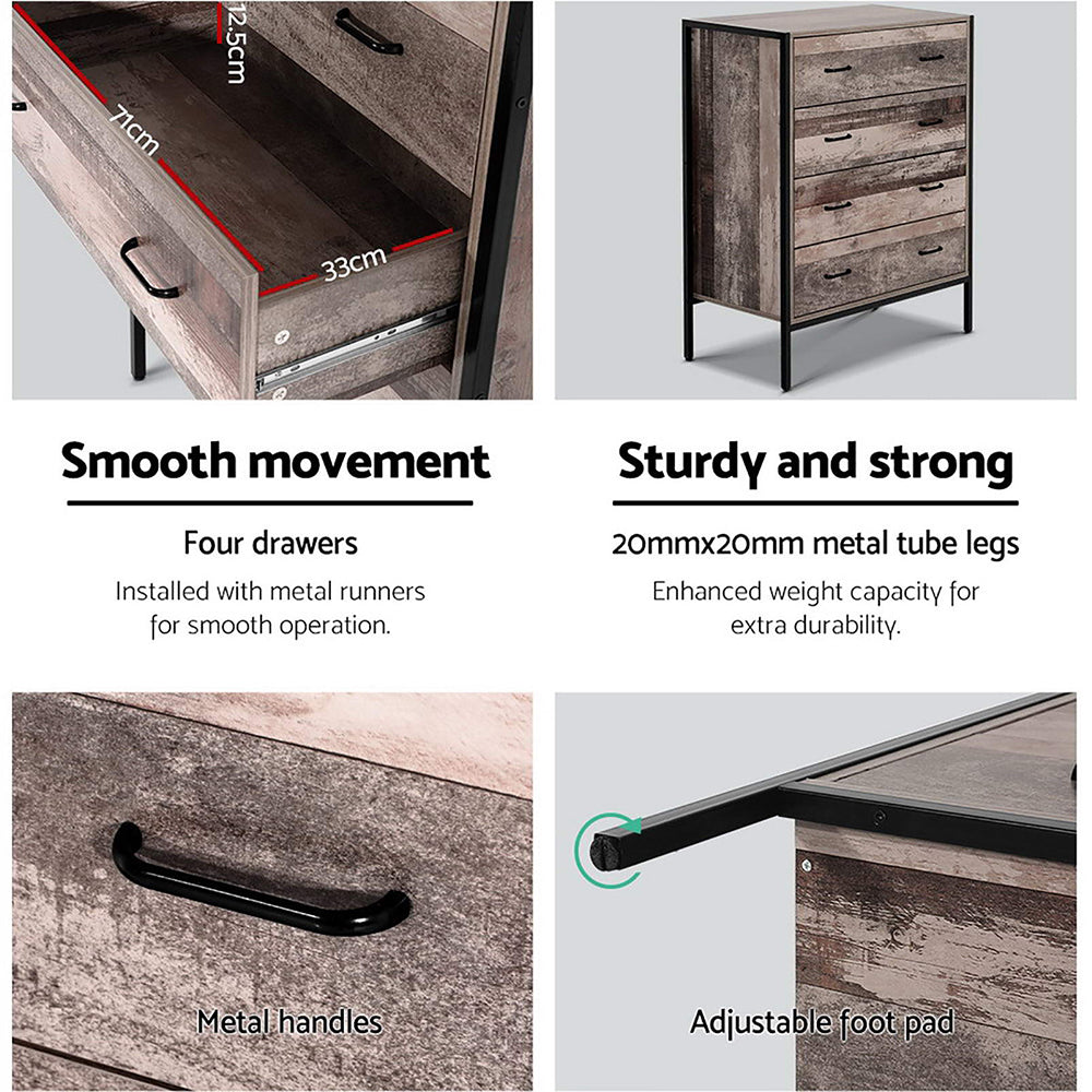 With its eclectic style, our Artiss 4-drawer Tallboy is visually stylish and totally practical. The look is unique and suits any modern or rustic decor perfectly. The four drawers are spacious and installed with metal runners for smooth movement and metal handles for reliability. Overall, the tallboy is built strong and sturdy with an enhanced weight capacity of up to 50kg. It also comes with an elevated design that comprises metal tube legs with adjustable foot pads to balance it on uneven floors if needed.