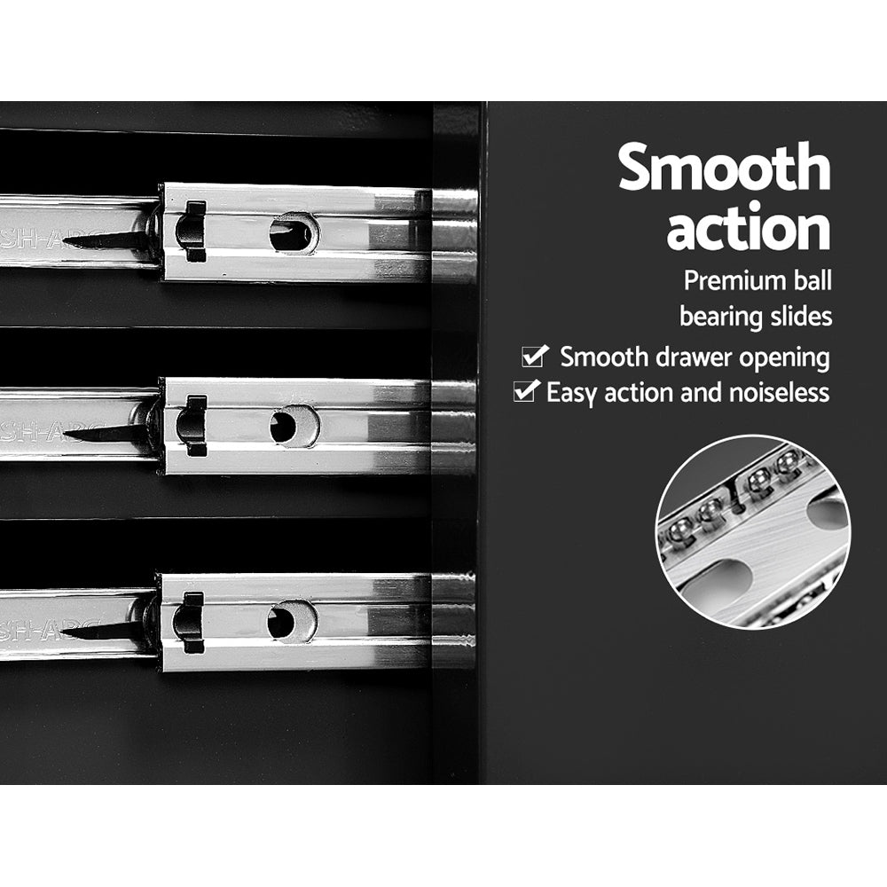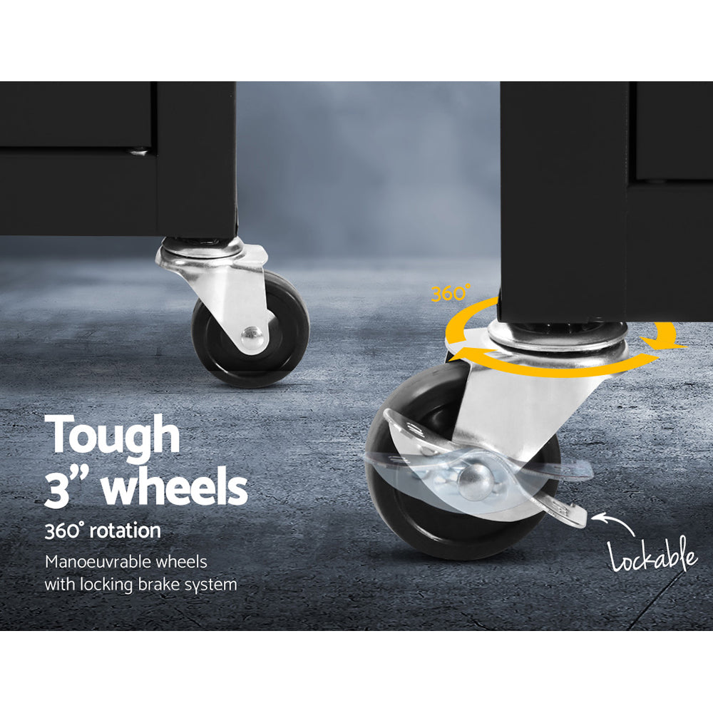 Made from high tensile powder-coated steel, the Giantz Tool Chest and Trolley is built to keep your precious tools in their proper place with drawers that are specifically designed to cater to various tool sizes. Comprising 15 drawers, with a 9-drawer chest and 6-drawer trolley, each drawer slides in and out effortlessly on quality ball bearings incorporated into the metal drawer runners. Each drawer is also lined with a gripped EVA pad to protect your tools and keep them from moving about. Better still, the set is installed with upgrade cam locks that are more reliable and secured compared to general locks. They also feature sturdy oval-shape handles that provide full grip and smooth handling. Not least, this heavy-duty ensemble is installed with four castor wheels with two that have brakes for easy mobility and fast standing.