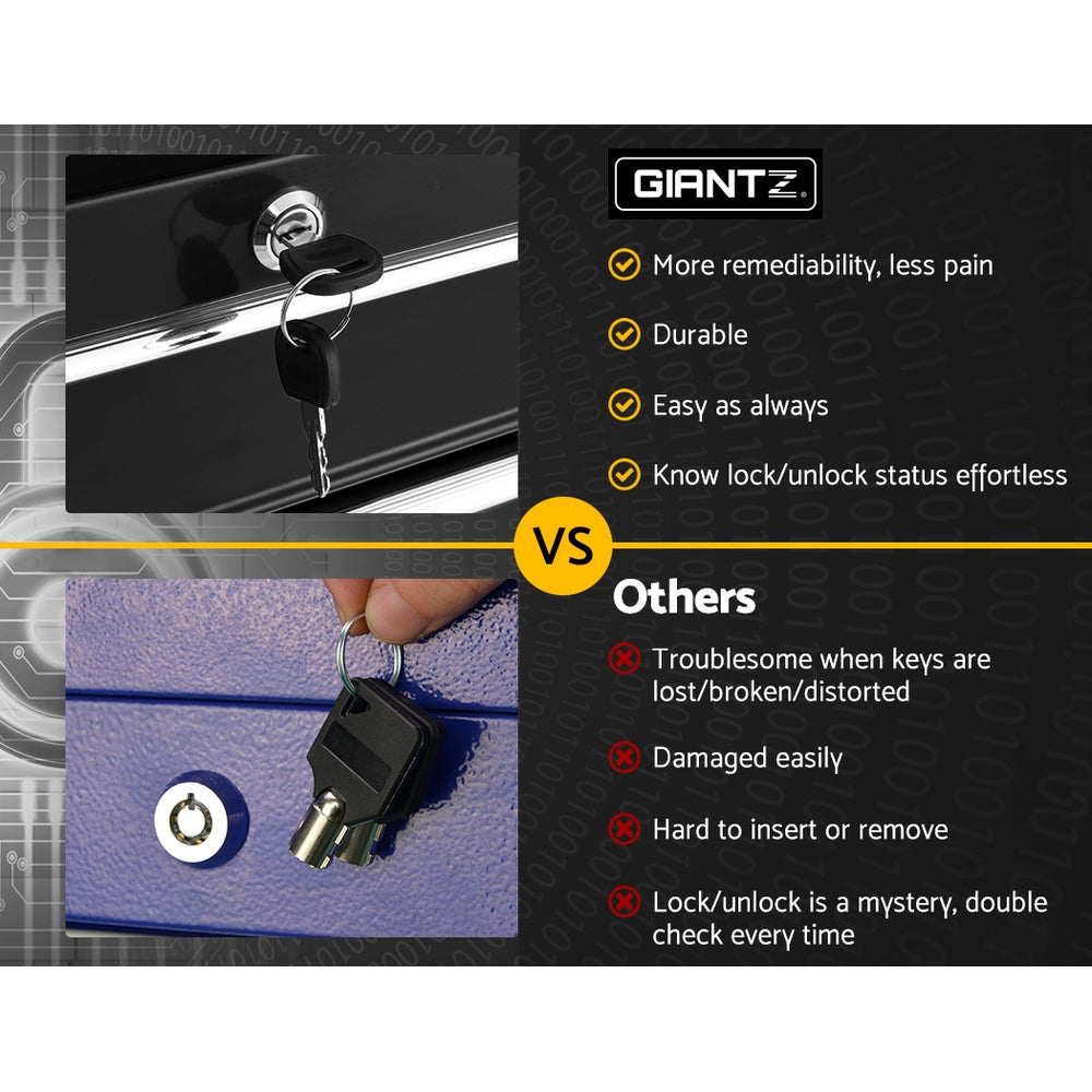The  item comes with a side handle and castors for mobility. Keep all the tools you  need in reachable range. All the drawers are fully lockable which is more  reliable to keep your tools in safety!