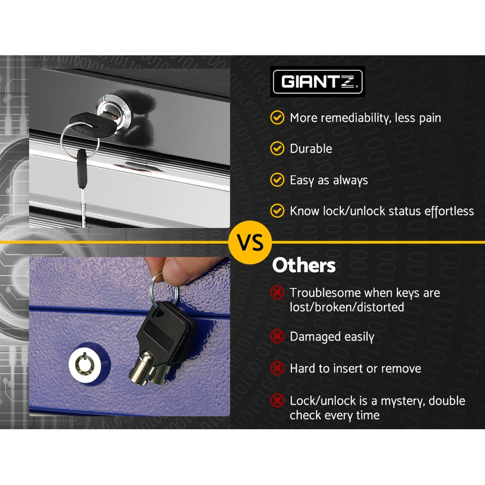 The  item comes with a side handle and castors for mobility. Keep all the tools you  need in reachable range. All the drawers are fully lockable which is more  reliable to keep your tools in safety!